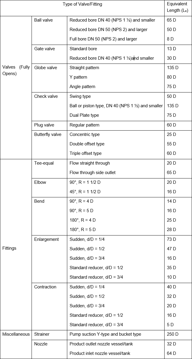 Several formulas have been developed to predict the minor losses across valves and fitting; however, another efficient way of doing this is by converting these losses to equivalent pipe length. In SPDC DEP 31.38.01.11-Gen, each fitting has been assigned an equivalent length of pipe; therefore, it is easier to estimate the minor loss using this method. The below table shows the equivalent length for fittings and valves as extracted from Table 6. DEP 31.38.01.11-Gen.