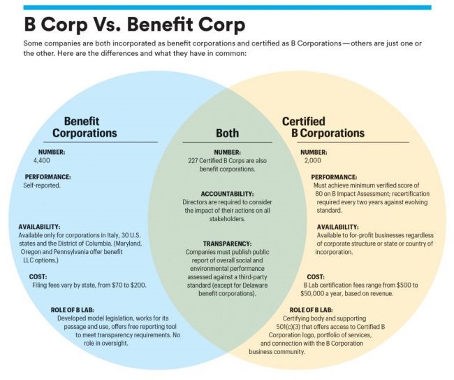 Figure 6. Differences and coincidences between B Corp and Benefit Corporations. Source: https://www.corpgov.net/2018/02/benefit-corporation-accountability-matters/